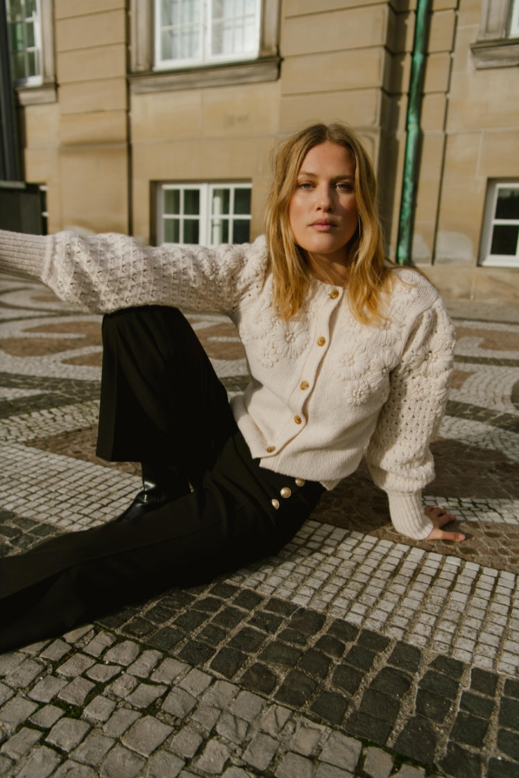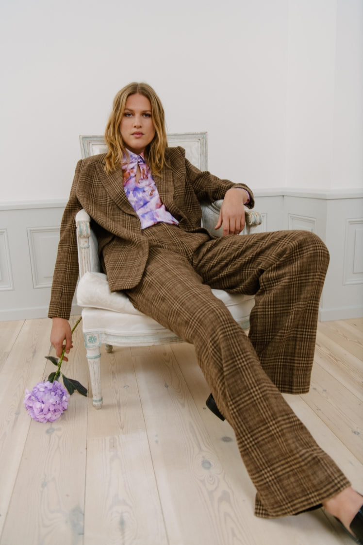 Throughout the collection, the play of masculine and feminine is key. A white poplin blouse, reminiscent of an artist’s shirt, has a high collar and volume sleeves and works beautifully with boyish baggy pants in Saville Row checks or pleated trousers in supple leather. Feminine touches such as tiny covered buttons, frilled cuffs and faggotted edges provide a dainty counterpoint to slouchy tweed blazers and unlined Prince of Wales checked belted coats. Denim loses its workwear image and becomes elegant and chic in a full skirt or bandstand jacket - gold buttons being a witty nod to jeans studs. Knitwear also plays with the contrast between artistic and lady-like with creative fringes bursting from the shoulders of a roll neck sweater or hand embroidered flowers tracing the neck of a cardigan that sit alongside a demure cropped jacket in a textured knit complete with corsage flower. After all, a woman’s wardrobe should reflect all aspects of her personality...