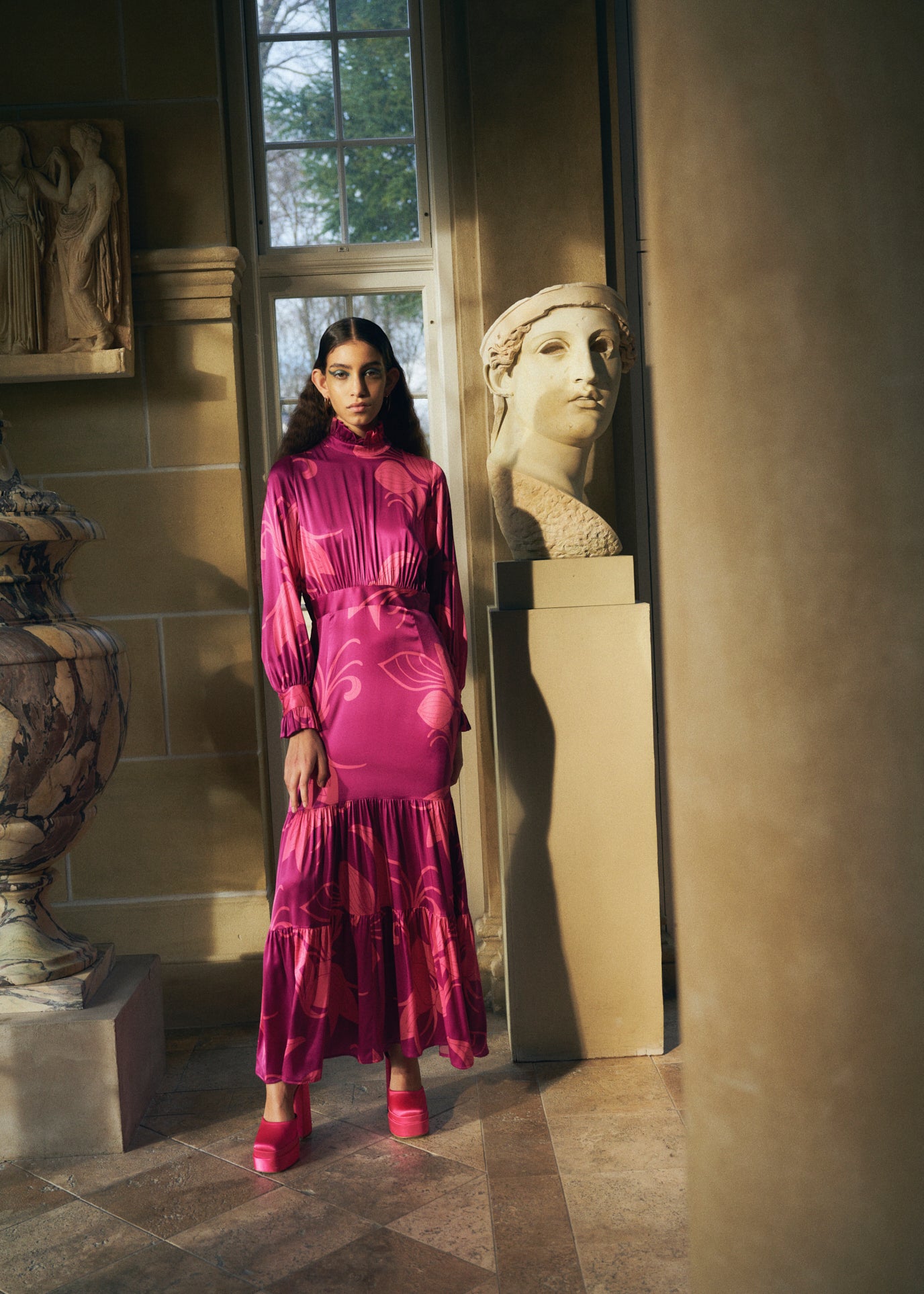 Prints, as always, play a central part with winter garden florals spilling down a dark background on a full-length dress or a graphic Art Deco design creating drama in an off-the-shoulder wide-legged jumpsuit. Elsewhere, huge orchids are scattered across a silk kimono and delicate peonies are placement printed on a black silk dress.