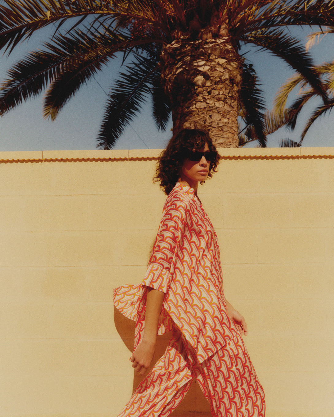 The colour palette is exuberant and uplifting with tropical shades of coral pink, mandarin, angelica green and ocean blue set against neutrals of black, white sand and champagne. Prints to reflect the Mayan surroundings, most notably in a bold wood-print inspired design of papaya and guava fruits or in huge hand painted florals in bright or pastel versions. The mid century minimalism of Tulum architecture is referenced in an op-art graphic print whilst the beauty of coral is captured a bold abstract pattern. Dea Kudibal’s signature silk is, as always, centre stage but light as-a-feather crinkle georgette is just right for balmy evenings and linen provides a welcome element of cool-to- the-touch texture.