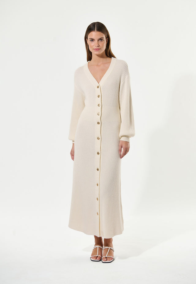 Long and body hugging, this luxurious creamy knitted dress is fits close to the body before flaring gently to fall to ankle length. Made from a soft wool mix yarn, the dress has a deep V neck, ribbed detail at the waist and cuffs and is buttoned down the front with beaten metallic buttons.