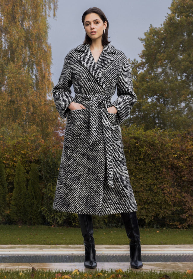 Perfect for cold weather, this long coat in heavy bouclé wood in a textured salt and pepper colour has a double-breasted front that fastens with hidden press studs. It has oversized pockets, turn-back cuffs, a deep slit at the back and a tie belt to pull it in for a strong silhouette.