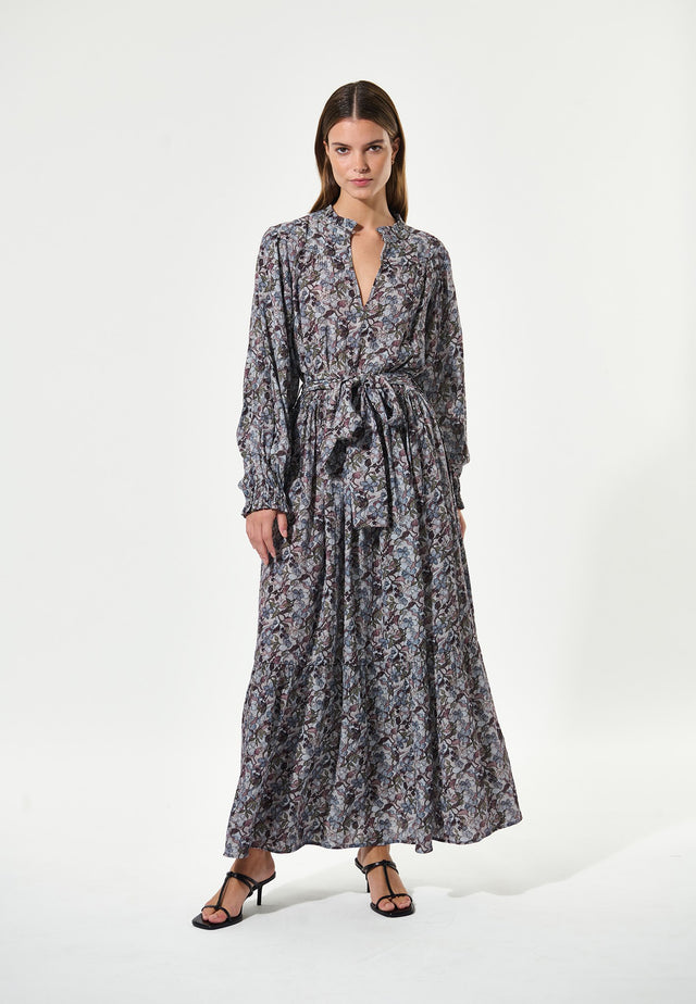 Sprinkled with small blue flowers, this crinkle viscose dress is slim over the body before flaring gently from the elasticated waist into an ankle length skirt. A ruffle sits at the neck as a feminine detail much like the elasticated cuffs with frills. A self fabric tie belt accentuates the waist.