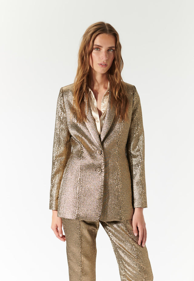 Cutting a very elegant silhouette, this burnished gold textured jacket with shawl collar makes a strong and stylish impact. The tight fitted shape defines the waist before widening to an elegant bell shape over the hips. Fastened with two fabric covered buttons, it has jetted button-holes and working cuffs. The blazer is fully lined with contrast piping. Wear on its own with simple pants or with the matching Cametti trousers to make a striking suit.