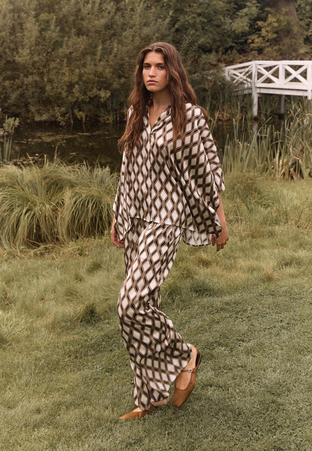 Oversized and easy to wear, this square cut blouse in a bold graphic print silk has 3/4 length sleeves, a hidden button front and a small stand collar. Wear with jeans for a casual day look or dress it up with a skirt for evening.