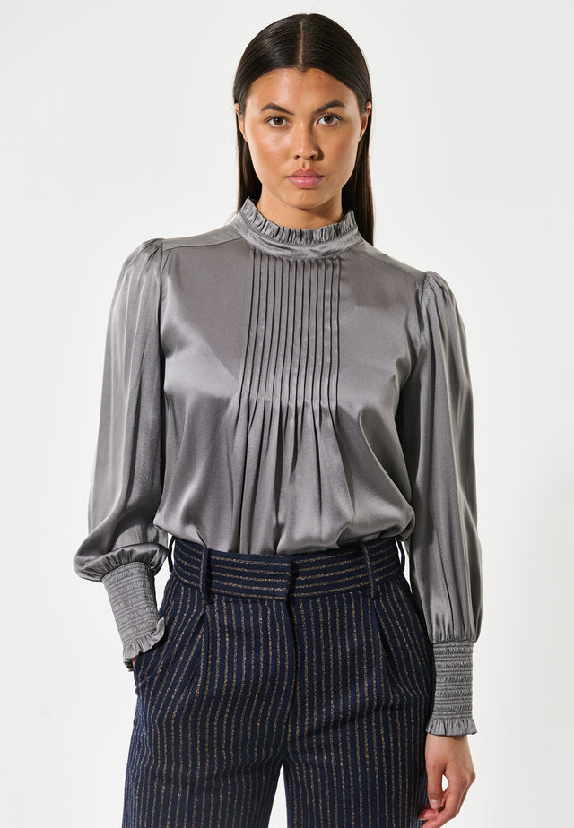 Small pin tucks gather into a stand collar with frill in this elegant regular fit silk blouse in a luxurious silvery grey. Full sleeves are finished with smocked cuffs and the top is fastened at the back with a keyhole opening and small button.