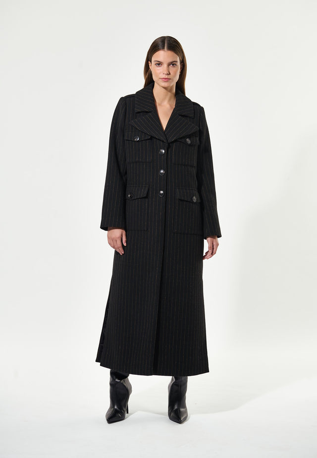 Long line and slim fit, this elegant coat in black pinstriped wool blend has a sense of drama. Wide lapels, four patch flap pockets and three high fastening brass buttons finish off the front whilst epaulettes and shoulder pads add to the silhouette. The coat is fully lined.