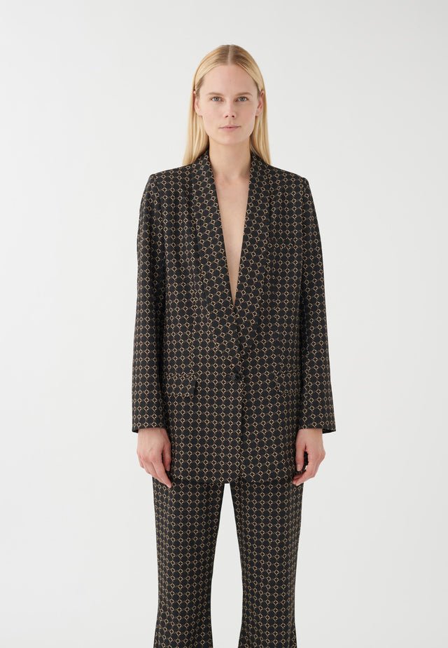 Loose fitting and easy, this slouchy jacket with a shawl collar and single button fastening is the ultimate in relaxed elegance. The small graphic print in muted colours is sophisticated and chic. Pair with matching trousers to create a stylish suit.