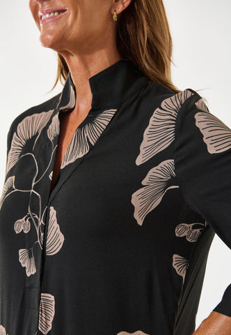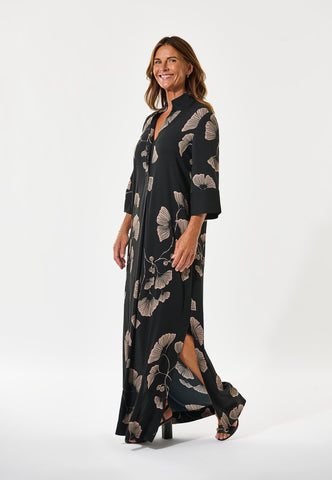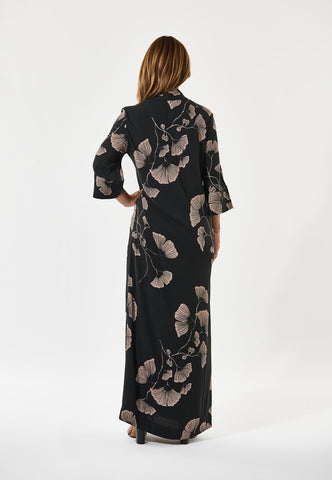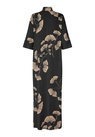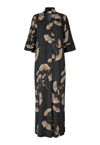 A much loved Dea Kudibal classic, Helga is a relaxed fit full length silk dress with a kimono style neckline, stand collar and 3/4 length wide sleeves. This version comes in a sophisticated Japanese inspired print depicting gingko leaves