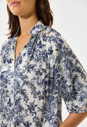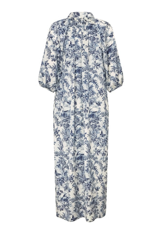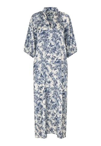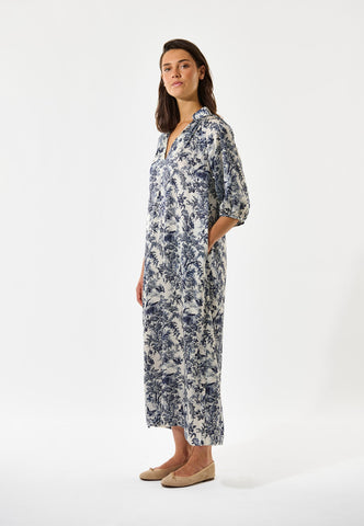 With an easy fit yet still sophisticated and flattering, this ankle length kaftan-style silk dress has a refined botanical etching print in navy blue. A very versatile addition to your wardrobe, it is relaxed enough to wear at home yet elegant enough to work for more special occasions.