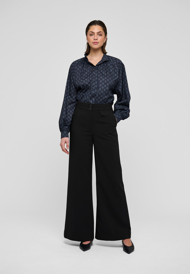 Delicate tucks gather the body into the multi-stitched high stand collar of this loose fit raglan sleeved blouse. The cotton voile fabric printed with a small graphic design and covered buttons add a sophisticated attitude.