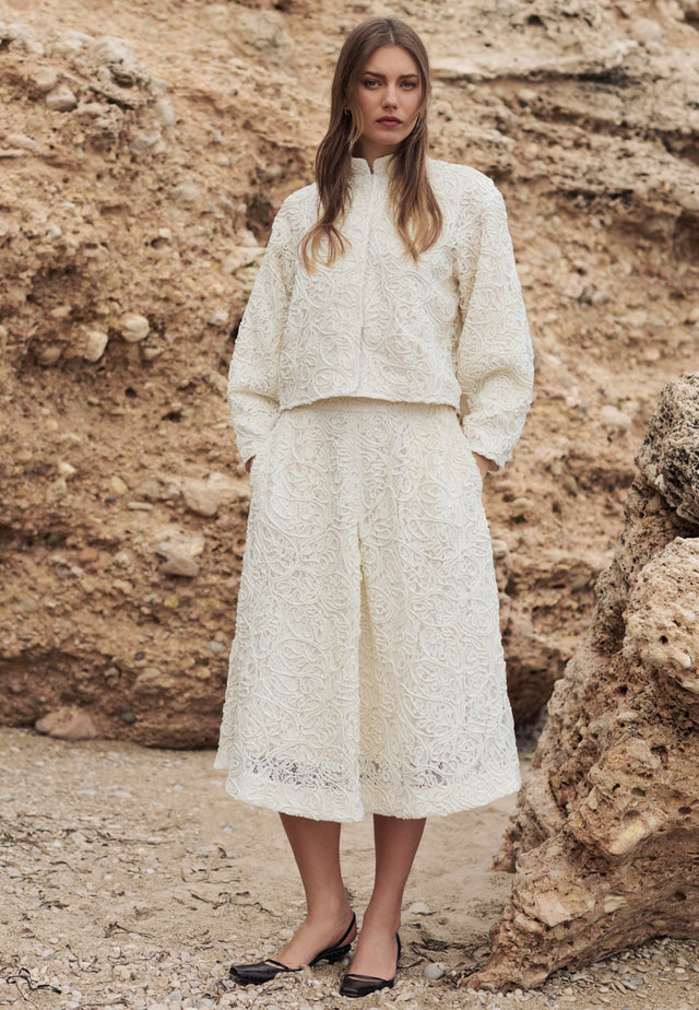 Fitted at the hips before flaring into a chic A-line that ends mid-calf, this skirt allows the beautiful cream lace to take centre stage. A large pleat in the front allows easy movement and there is a concealed zip at the centre back. The skirt is fully lined.
