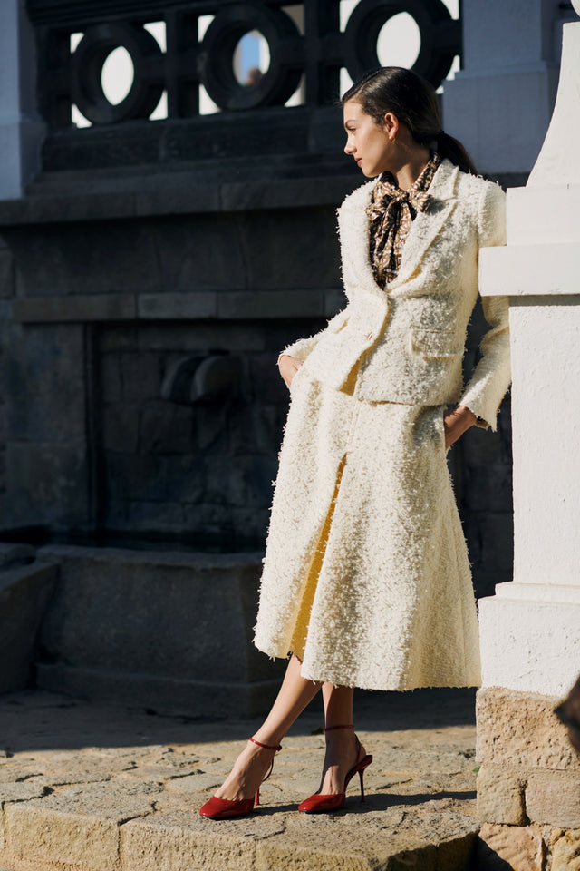 Supremely elegant, this cream silk/linen bouclé skirt works beautifully for both day and evening. Fitted at the waist, it flares into an A line with a large box pleat at the front allowing movement. It has side pockets and is fully lined.