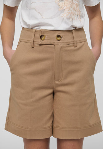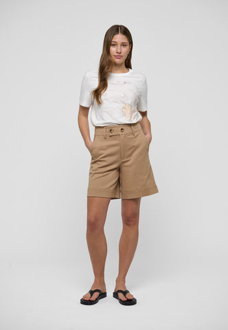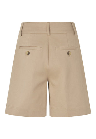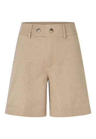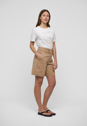With a high waist and full legs, these shorts in beige cotton drill can be worn with a simple t-shirt during the day or styled with a silk blouse for evening. Two side pockets add a sense of relaxed ease.