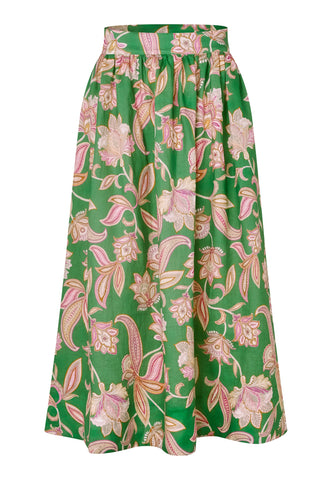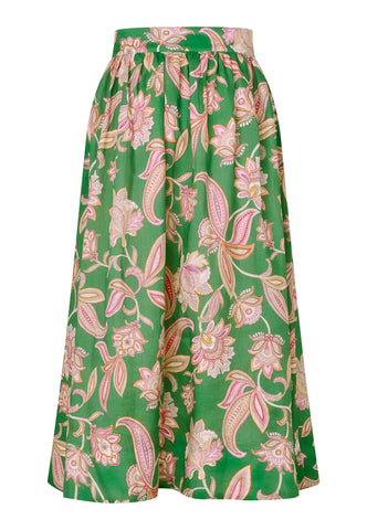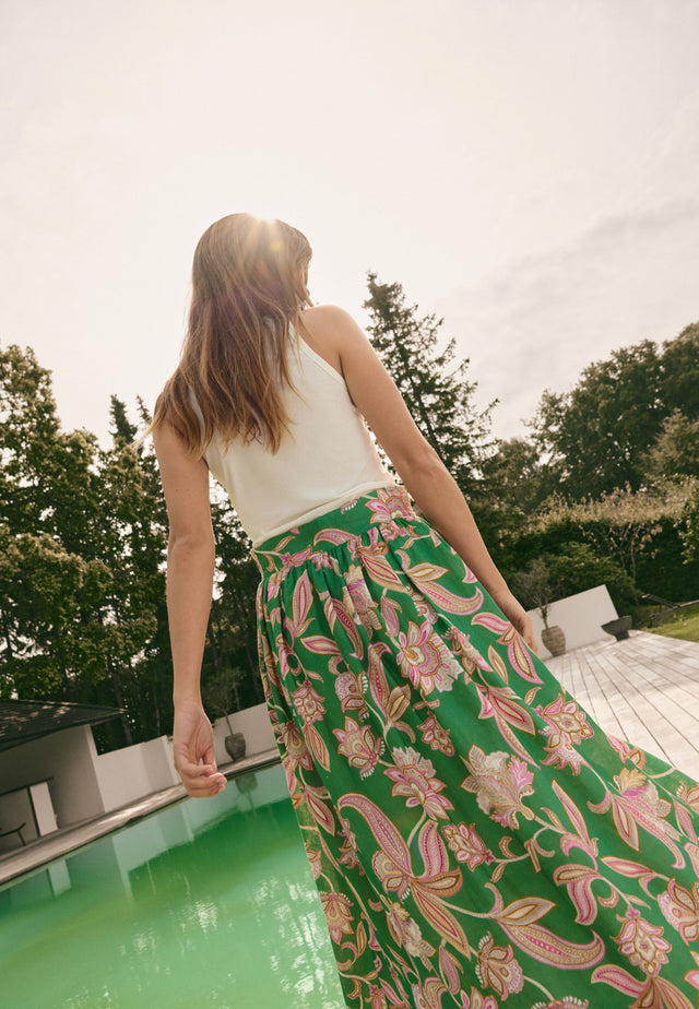 Relaxed and easy to wear, this stylish full skirt is gathered with tiny tucks into a waistband and falls to the ankle. This version comes in summery linen with a bold green floral print and has pockets and a zip closure.
