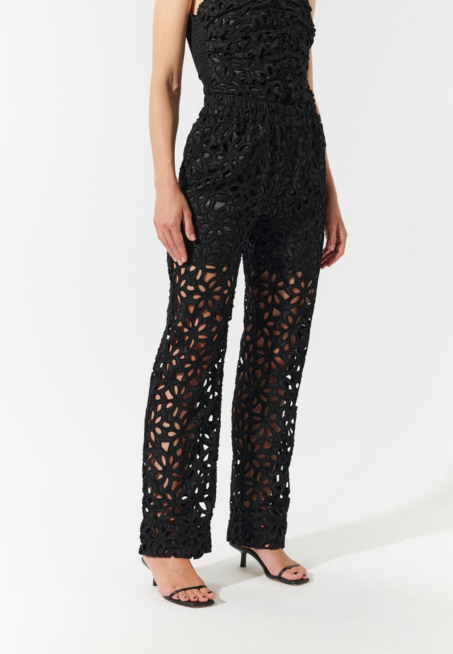 Oversized broderie-anglais in black makes an unusual and stylish option for a trouser but works beautifully when paired with a simple shirt or blazer. This pair are slim fit with an elasticated waist and straight leg. There are side and back pockets and they are half-lined with a ‘shorts’ style inner.