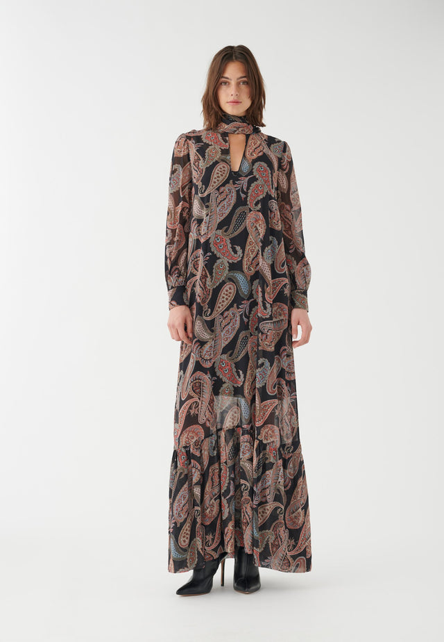With its easy fit, v neck and deep flounce at the hem, this full length dress is relaxed and chic. The bold paisley print and scarf at the neck give it a sophisticated bohemian vibe.