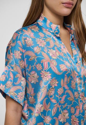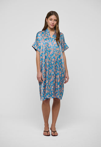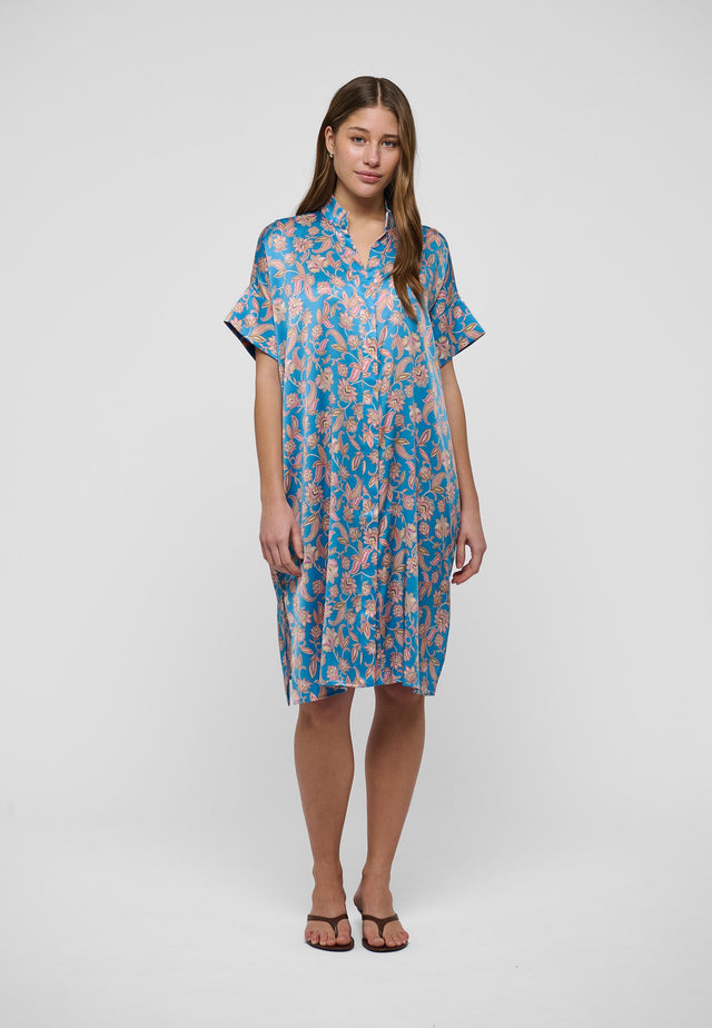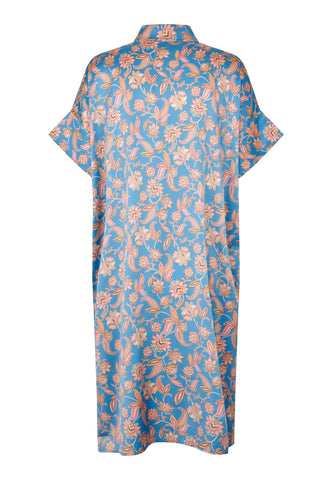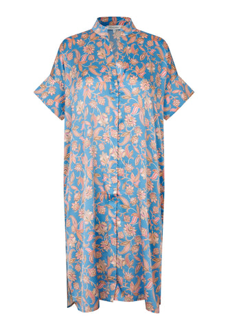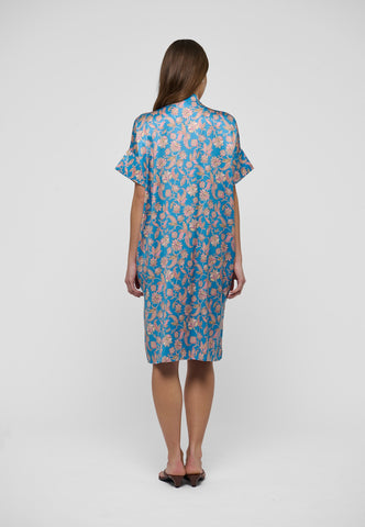 Easy fitting and relaxed but not at the expense of style, this kaftan style dress in silk twill has a sophisticated print of flowers and leaves scattered over a rich blue background. There is a stand collar and cross-over fly front and deep cuffs finish off the sleeves.