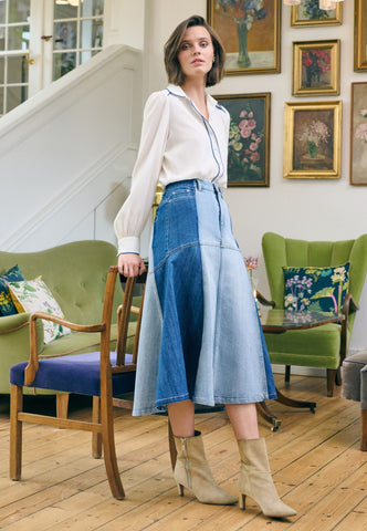 Cleverly combining both dark and washed denim, this skirt is fitted at hips and then flares out to stop mid calf. Jeans pockets, belt loops and metal studs give it an urban workwear vibe and it looks great worn with a shirt or a simple knit.