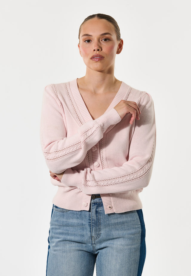 Delicate rows of lace stitch run down the front and around the shoulder seams of this cotton/wool blend cardigan in pale pink. Knit covered flower buttons are a delightful finishing touch. Wear with jeans during the day or over a silk dress in the evening.