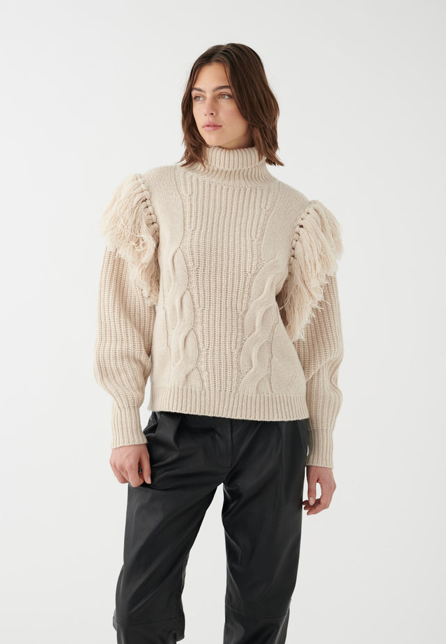 Add a bit of drama to your knitwear collection with this beautiful creamy high neck sweater with fringes running across both shoulders. Voluminous sleeves and large cables at the front are further enhancements to a bold design.
