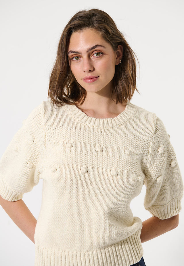 Neat and stylish, this fitted sweater in natural white cotton/wool blend has short puff sleeves that give it a bit of a retro vibe. The horizontal textured stripes feature 3D dots that add a subtle detail to the jumper.