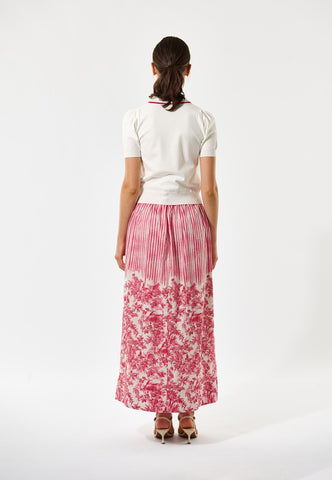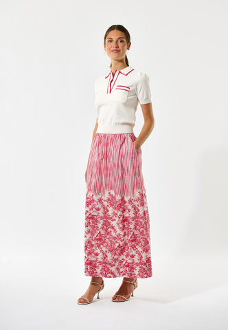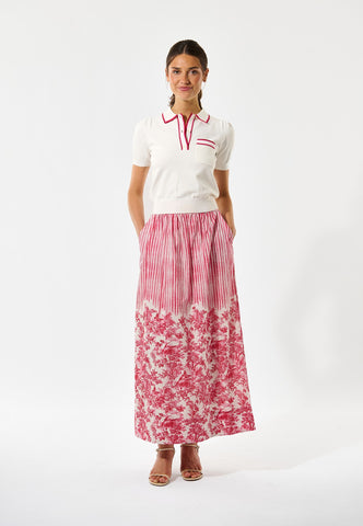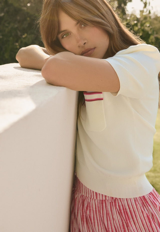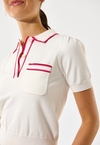 The ultimate in sporty chic, this white knitted polo top in a soft viscose blend sits close to the body with rib at the waist and cuffs. Contrast stripes in red and pink run around the collar and button placket and across the patch chest pocket.