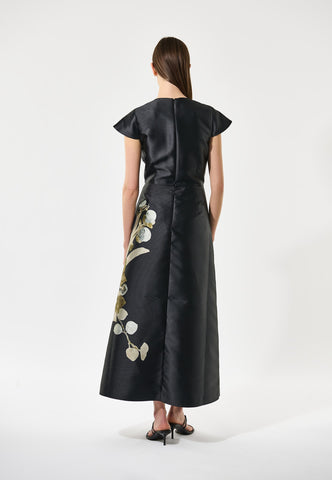 With its sculptural cap sleeves and gently flared skirt, this structured dress has a sense of minimalist elegance. Made from black taffeta printed with oversized lotus flowers creeping up from the hem, it has a real impact. The dress has a fitted bodice with a deep V front, a zip at the back and falls to ankle length.