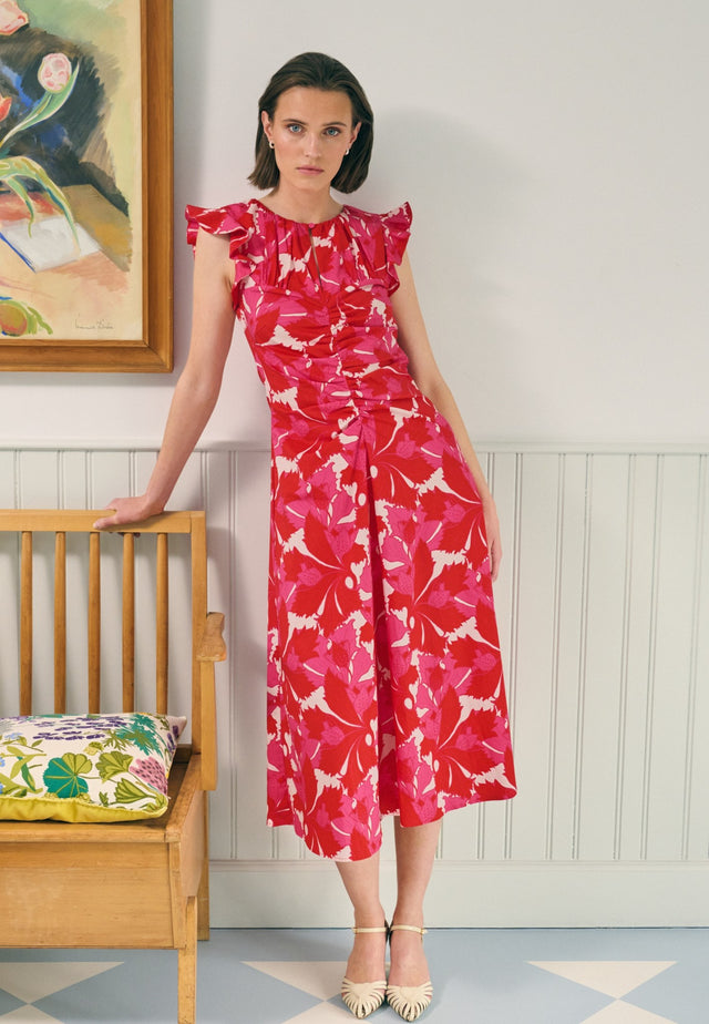 Large frills at the shoulders give this beautiful cotton poplin dress a striking silhouette as they give way to a fitted bodice with gathers at the neck and a skirt that falls to mid calf. Gathering also creates shaping down the front and a keyhole opening with single button is an elegant detail. The bold print of red and pink leaves adds a bit more drama into the mix.
