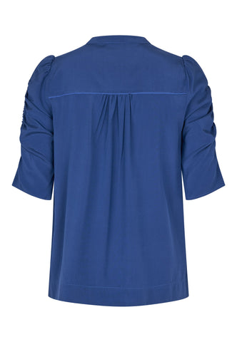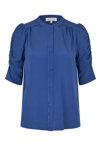 Made from the deepest blue silk, this regular fit shirt has an easy but sophisticated attitude. A band collar keeps things simple whilst half length sleeves have ruching on the outer edge. Piping in paler blue on the shoulders and front placket and delicate covered buttons are refined finishing touches.