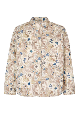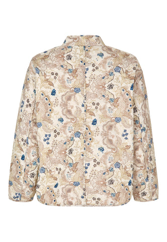Cosy but very stylish, this quilted cotton jacket is perfect for those chilly spring days. Printed with exotic flowers in shades of neutral tones, the jacket has a stand collar with multi stitching, binding around the edges and two jet pockets at the front. It is cropped in length, has 3/4 sleeves and closes with covered snap buttons.