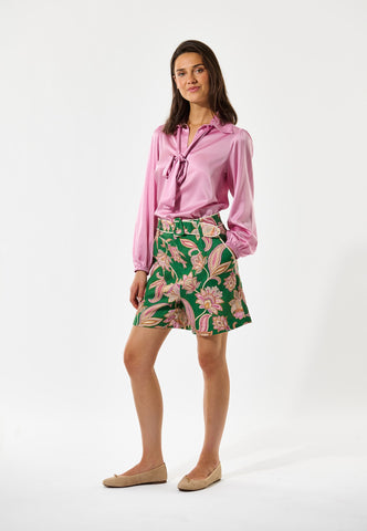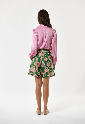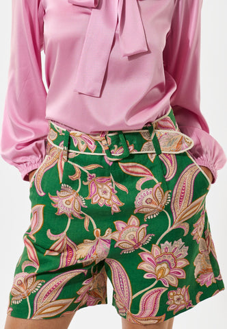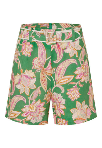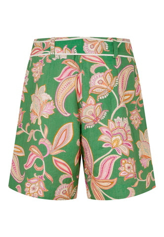 Hitting a great balance between casual and dressed up, these linen shorts are in a striking paisley print on a bright green background. Sitting high on the waist and falling to just above the knee, they have a matching belt with fabric covered buckle.