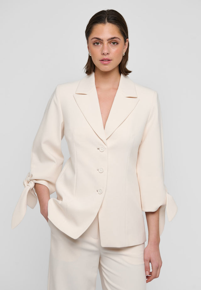 Two bows placed at the cuffs of 3/4 length sleeves are unexpected but charming details on this fitted jacket. Crafted from cream viscose crepe, the blazer has wide lapels and is fastened by three decorative buttons down the front. Wear on its own or make as part of a very chic suit with the matching Lamars pants.