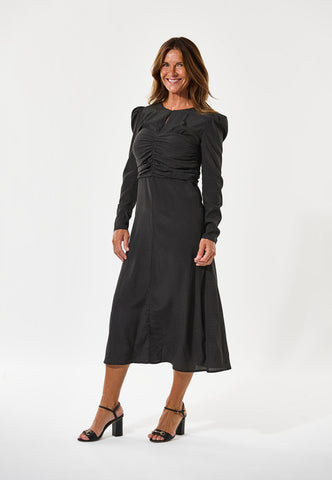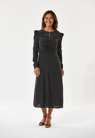 Delicate ruching pulls in the pin spot silk fabric on the bodice of this dress creating a body skimming style that falls in a slightly flared skirt to just below the knee. Puffed shoulders with removable shoulder pads on the long slim sleeves adds to the silhouette whilst a key hole opening at the front gives a glimpse of skin. The dress is fastened by a concealed zip at the back.