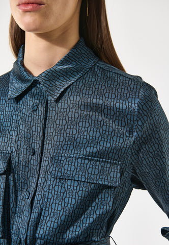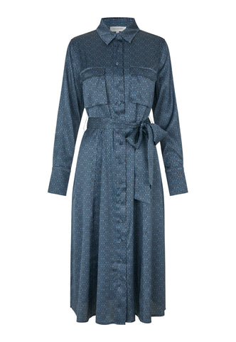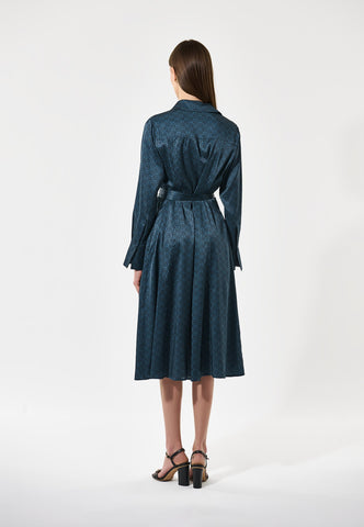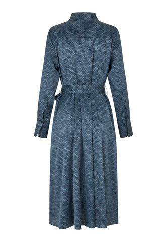 A shirt dress is a classic and stylish option for both day and evening. This version in monogram printed navy silk has a regular fit that is pulled into the waist with a self fabric belt and stops at mid calf. Two flap patch pockets and covered buttons are refined details.