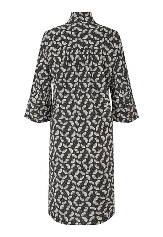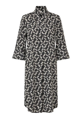 One of Dea Kudibal’s most beloved and popular styles, this easy fit mid-calf length dress is relaxed yet sophisticated. The kimono neckline and collar give it a stylish elegance whilst the deep sleeves with cover buttons have a laid back air. This chic version comes in silk with a small print featuring gingko leaves.