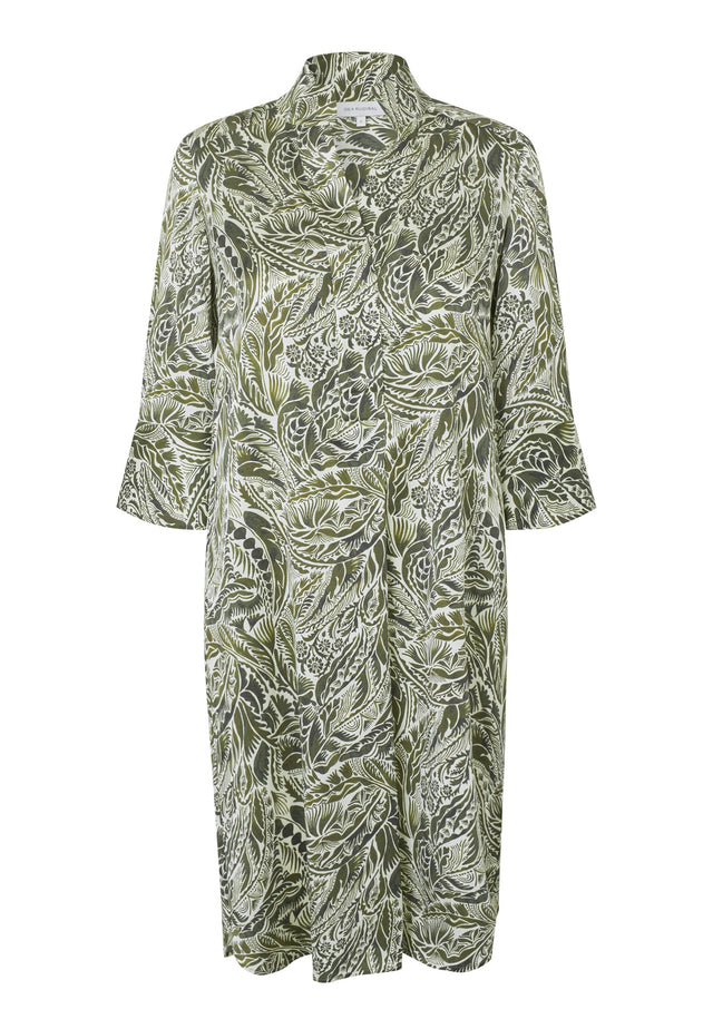 Undoubtedly one of Dea Kudibal’s most popular styles, this easy fit mid-calf length dress is perfect for summer. The kimono neckline and collar give it a sophisticated elegance whilst the deep sleeves have a relaxed air. This elegant version comes in a leaf print on viscose crepe.