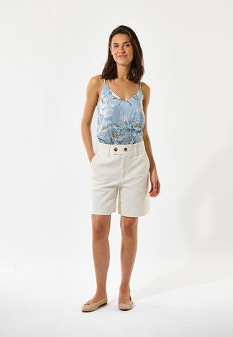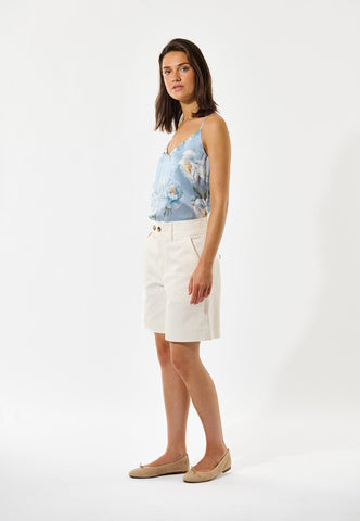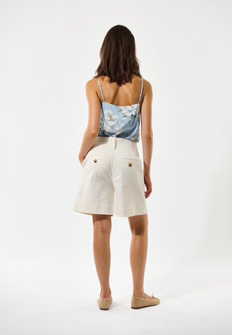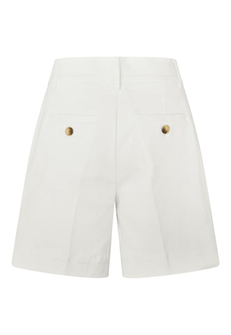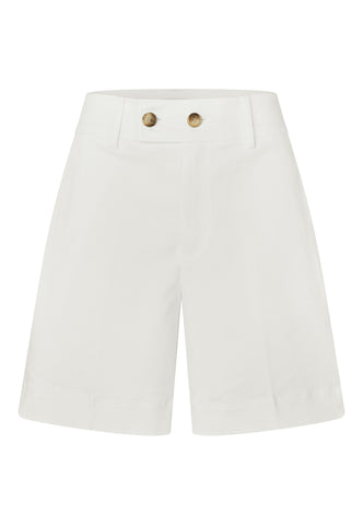 High waisted and with a full leg, these shorts in white drill can be worn with a simple t-shirt during the day or dressed up with a silk blouse for evening. Two side pockets add a sense of relaxed ease.