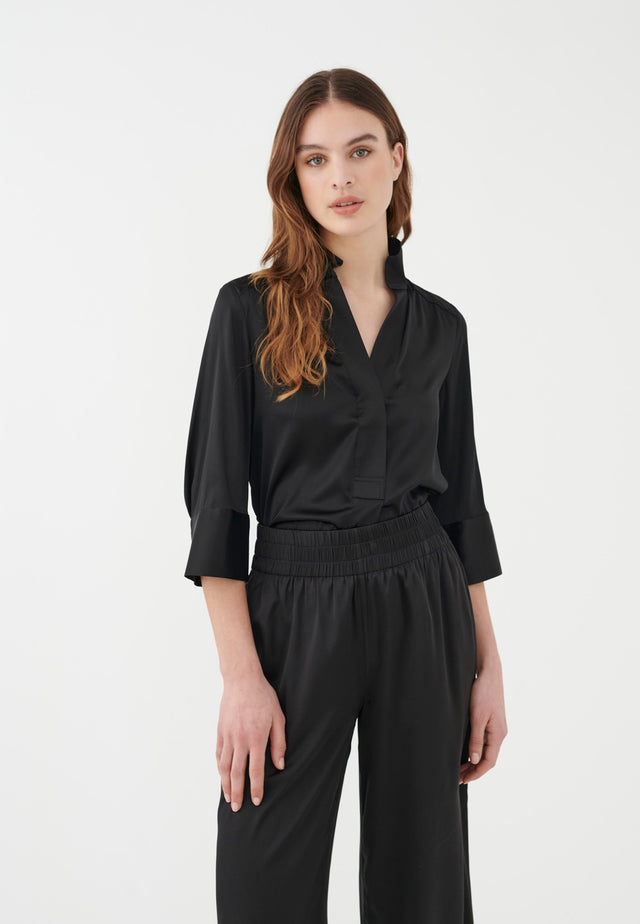 Chic and sophisticated, this high collared blouse has a cross-over placket that evokes a kimono. The deep cuffs and black silk satin fabric add to its air of elegance.