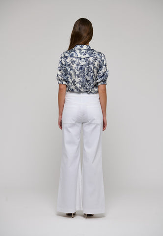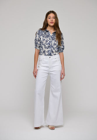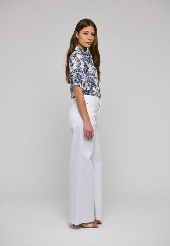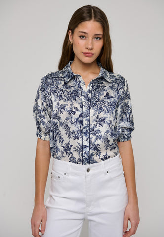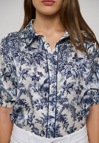 A short sleeved shirt in silk is a great addition to a summer wardrobe. This version has a classic collar and an easy fit and comes in a stylish blue print depicting exotic flowers with contrast blue piping details.