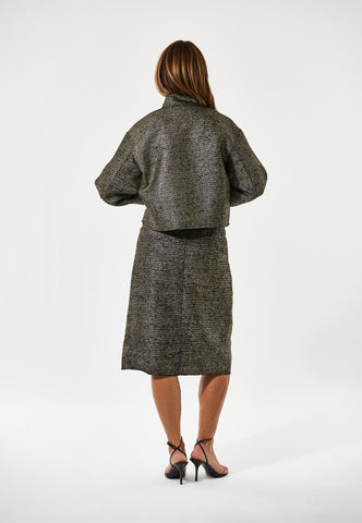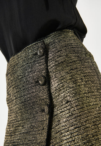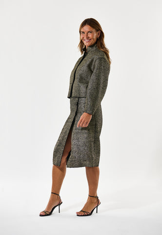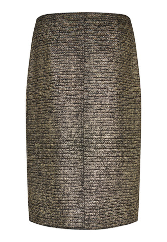 Slim, elegant and very sophisticated, this skirt in a luxurious gold bouclé fabric fits close to the hips and falls to below the knee. An asymmetric opening at the front is closed by three embroidered buttons. Wear with a simple shirt or knit or make a stylish suit with the matching Safa jacket.
