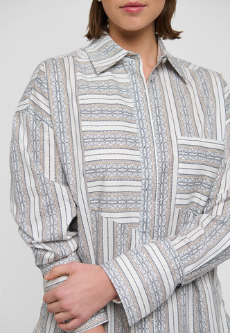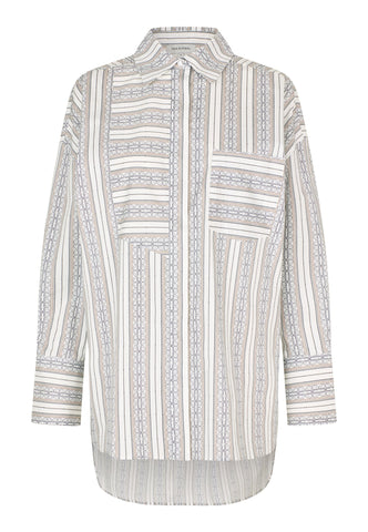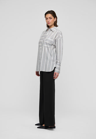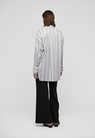 Oversized and relaxed in attitude, this easy fit cotton shirt in bold decorative stripes has a classic collar and deep cuffs. A half bib panel and breast pocket are cut horizontally to give a graphic twist to the shirt. It fastens down the front with a fly that hides the buttons.