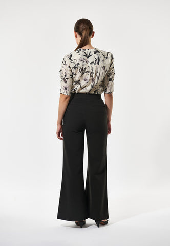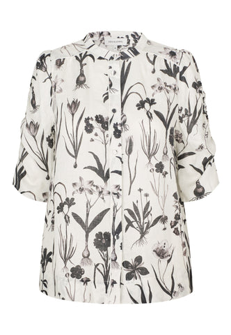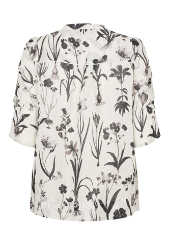 Scattered with black botanical drawings, this regular fit linen shirt has an easy, summertime attitude. A band collar keeps things simple whilst half length sleeves have ruching on the outer edge. Piping in white on the shoulders and front placket and delicate covered buttons are refined finishing touches.