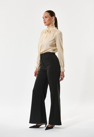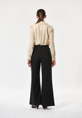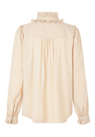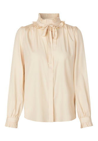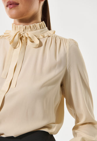 Two rows of frills tied together with a self fabric bow form a dramatic collar on this elegant and sophisticated blouse made from cream coloured silk. Full sleeves add to the silhouette and tiny frills finish off the cuffs.