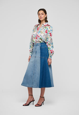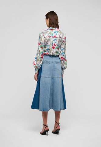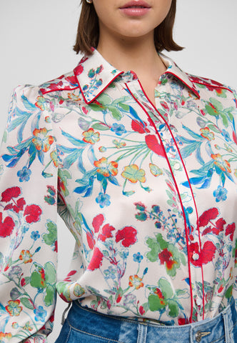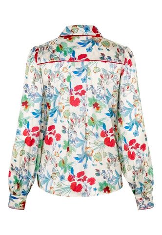 Bold red piping runs around the collar, across the shoulder and down the front of this brightly printed floral silk shirt creating a graphic, modern twist on a classic garment. It is in a regular fit with full sleeves and a hidden button placket.