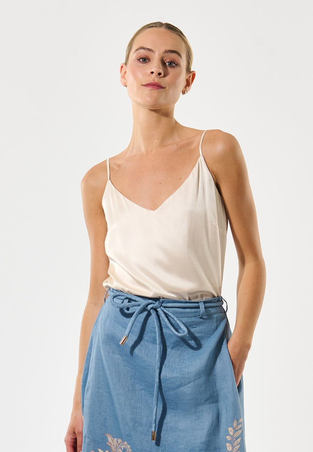 A camisole top is a useful and chic addition to any woman’s wardrobe. This regular fit version in off white silk hangs from adjustable spaghetti straps and is half lined in self fabric for a luxurious touch.