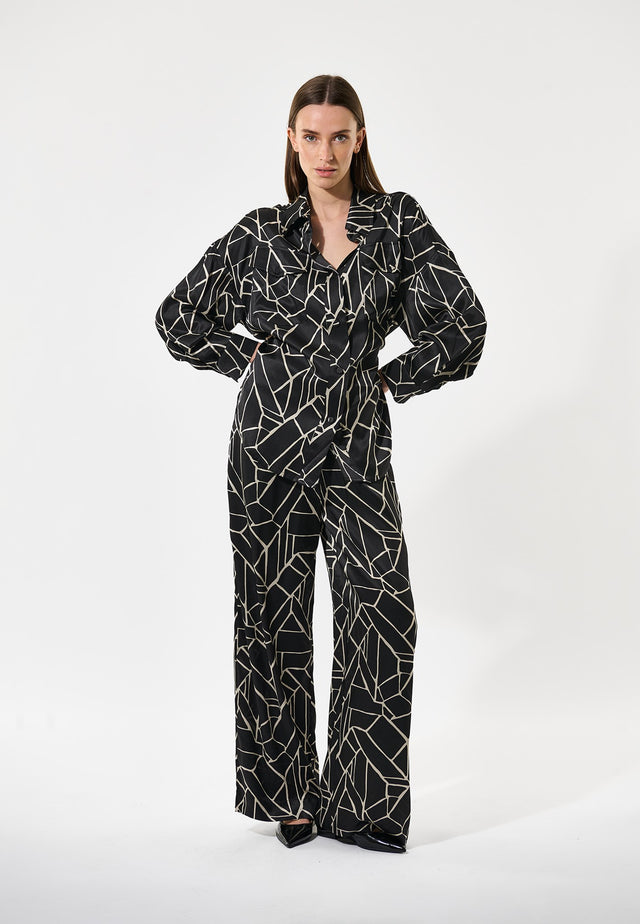 Wide leg pants in silk have a timeless appeal and this pair in a bold black and white print with a wide elastic waistband are a great example. Wear with a simple top or a knit for an effortlessly stylish outfit.