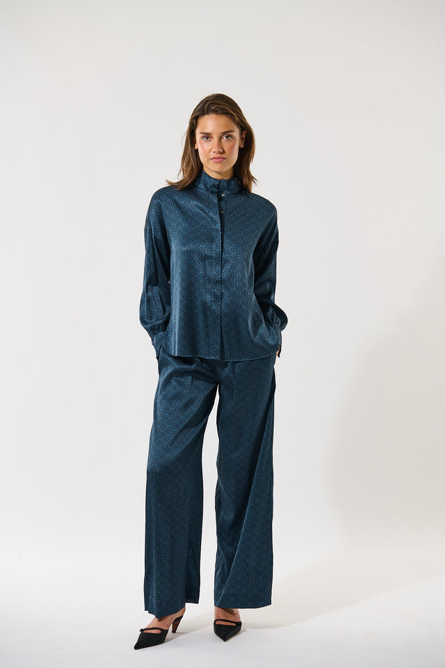 Wide leg pants in silk have a classic appeal and this pair in a small graphic monogram print with a wide elastic waistband are a great example. Wear with a simple top or a knit for a relaxed but stylish outfit.