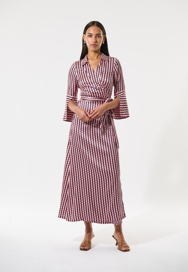 Clean cut and sophisticated, this full length wrap dress is pulled into the body with the self fabric tie belt. The graphic print in silk brings a decorative touch whilst the collar and deep cuffs with slit give it a refined attitude.