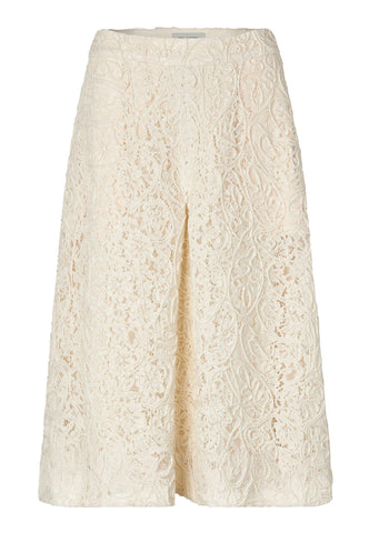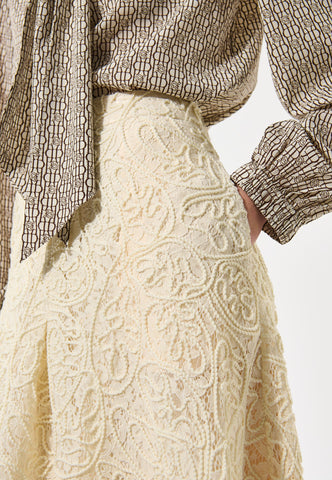 Fitted at the hips before flaring into a chic A-line that ends mid-calf, this skirt allows the beautiful cream lace to take centre stage. A large pleat in the front allows easy movement and there is a concealed zip at the centre back. The skirt is fully lined.