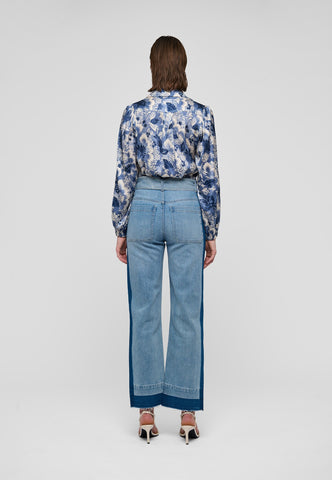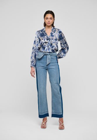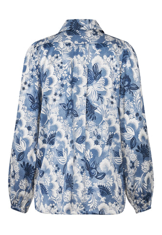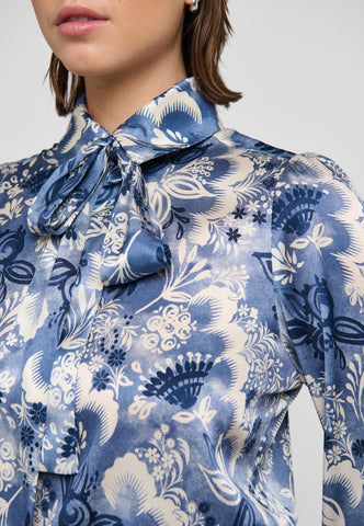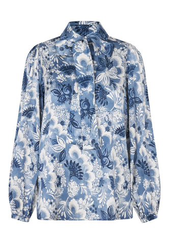 Versatile and chic, a tie neck blouse in silk is a wardrobe essential. This version in a beautiful print of exotic flowers in shades of blue has a regular fit with full sleeves and narrow cuffs. Tie the neck scarf in an extravagant bow or let it hang loose for a more relaxed attitude.